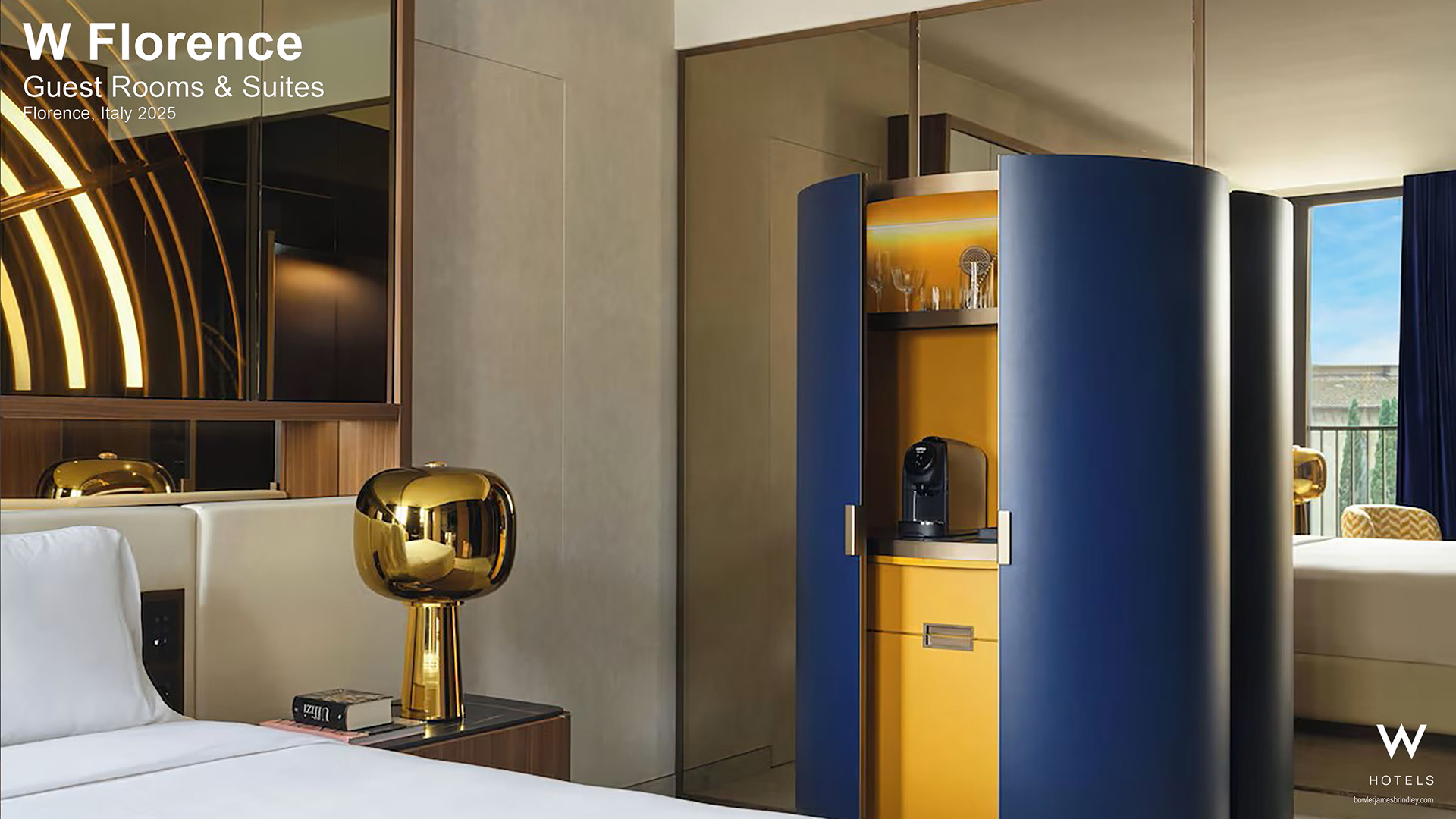 W Florence is a landmark hotel that opened in 2025. It occupies a renowned 60s modernist building in the heart of this world-famous Renaissance city. It is solely the vision of the owners - a private family with a love of European history and culture. BJB have designed all 119 guest rooms and suites.